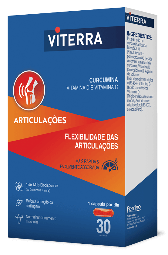 Viterra Articulações em cápsulas fáceis de tomar, à base de Curcumina, Vitamina D e Vitamina C, reforça a função da cartilagem contribuindo para a flexibilidade das articulações!